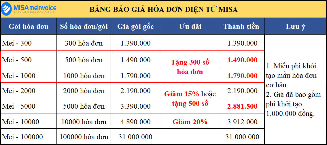 Bên cạnh đó, Đại lý thuế TASCO cũng xin cung cấp bảng giá hóa đơn điện tử được cung cấp bởi MISA - meInvoice trong bài viết này để quý doanh nhân thuận tiện hơn trong việc tham khảo: