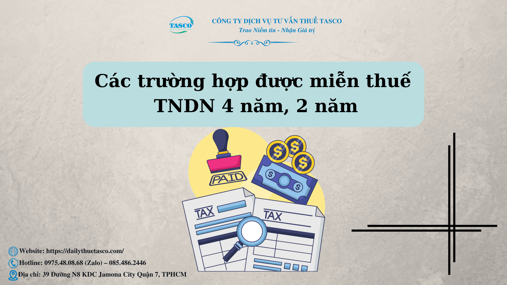 Đại lý Thuế Tasco cung cấp các thông tin về quy định các trường hợp được miễn thuế thu nhập doanh nghiệp (TNDN) 4 năm, 2 năm, nhằm giúp quý doanh nghiệp thực hiện đúng các thủ tục miễn thuế theo đúng quy định pháp luật hiện hành.