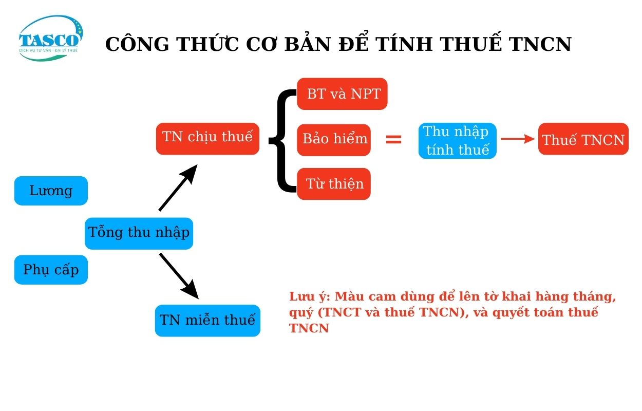 Sử dụng công thức trên theo thứ tự (1) (2) (3) để tính thuế thu nhập cá nhân theo các bước như sau: