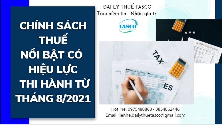 Các chính sách thuế là một trong những quy định quan trọng và thường xuyên được cập nhật, thay thế, bổ sung để phù hợp với điều kiện phát triển kinh tế doanh nghiệp hiện nay. Kể từ tháng 8/2021, một số quy định nổi bật về thuế sẽ được áp dụng mà các doanh nghiệp cần biết để thực hiện. Đại lý thuế TASCO xin điểm qua một số chính sách thuế có hiệu lực từ tháng 8/2021 trong bài viết dưới đây, kính mời quý doanh nhân và bạn đọc tham khảo.
