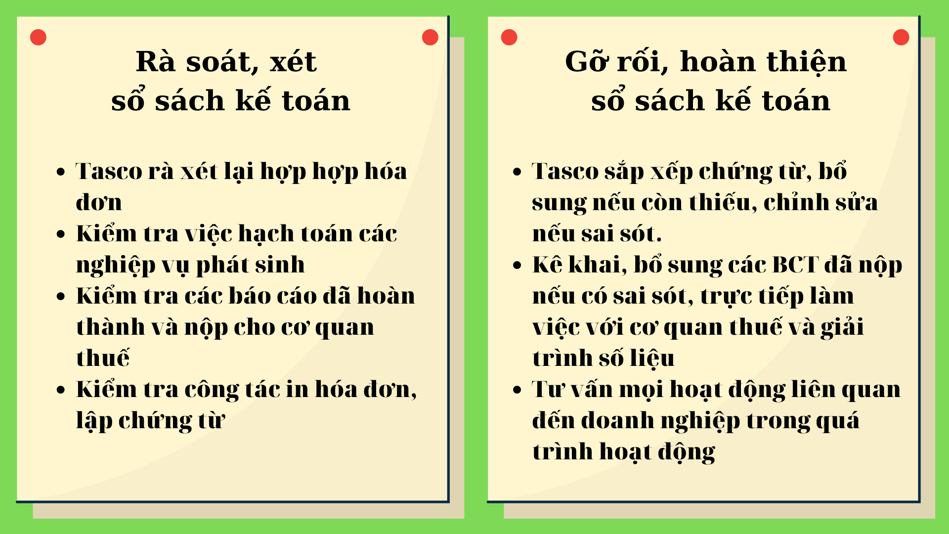 ✅ Tasco tiến hành rà soát, xét, kiểm tra toàn bộ sổ sách kế toán của doanh nghiệp những năm trước đó. Điều chỉnh, bổ sung những sai sót giúp doanh nghiệp an tâm khi có đề nghị kiểm tra sổ sách của Cơ quan thuế.