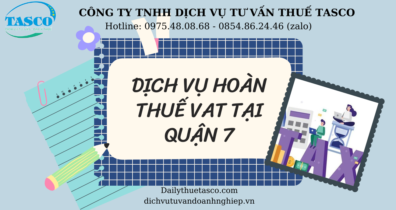 DỊCH VỤ HOÀN THUẾ VAT TẠI QUẬN 7 của Đại lý thuế TASCO sẽ tư vấn, hỗ trợ quý khách hàng chuẩn bị các thông tin cần thiết phục vụ cho việc lập hồ sơ hoàn thuế GTGT, thay doanh nghiệp thực hiện toàn bộ thủ tục, hoàn thiện sổ sách kế toán và lập hồ sơ xin hoàn thuế, nộp hồ sơ hoàn thuế GTGT đến cơ quan thuế và cam kết hỗ trợ doanh nghiệp giải trình hồ sơ hoàn thuế khi có thanh tra kiểm tra theo đúng quy định.