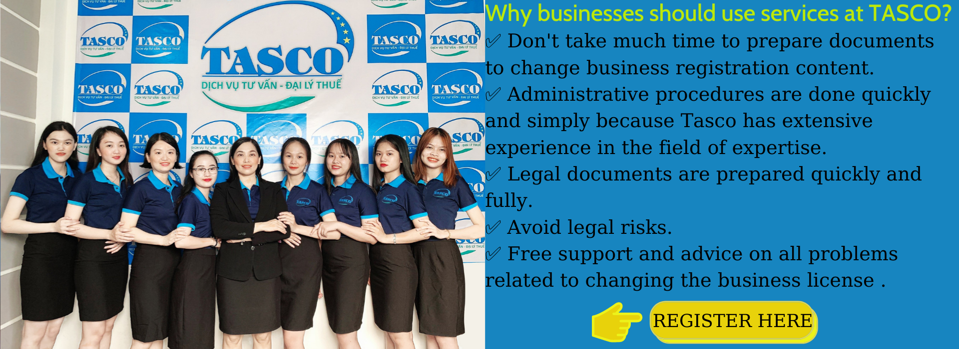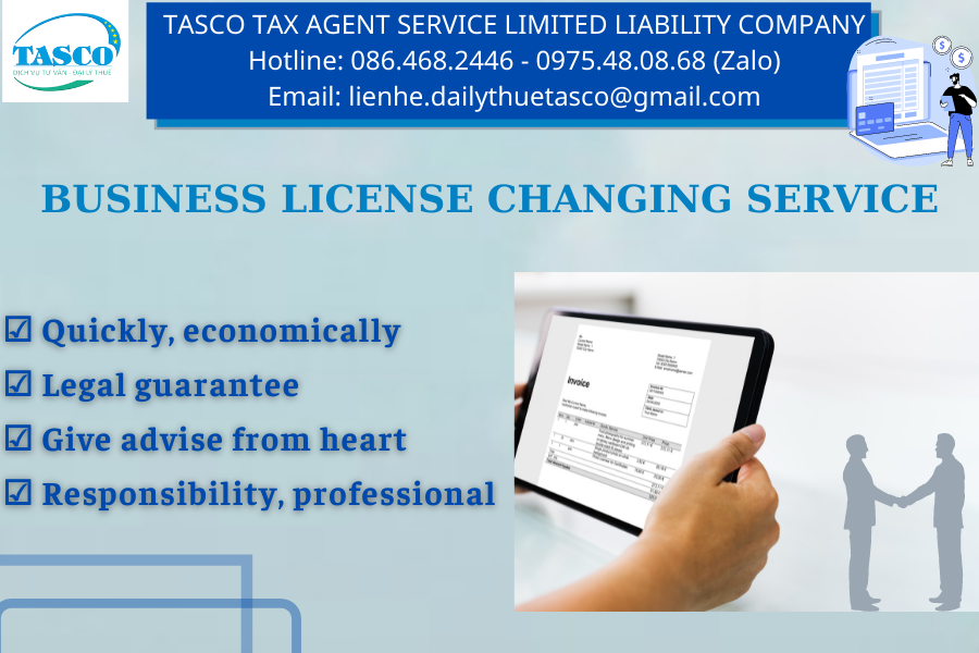 ? Don't worry, TASCO takes care of anything difficult things, TASCO offers a comprehensive solution for your business "Business license changing service", TASCO will help you to share your worries and reduce your legal burden. TASCO is proud to be founded by experts who are financial directors, chief accountants, tax agents with more than 15 years of experience, high professional qualifications and practical knowledge in the field of tax consulting, accounting services. accounting, management consulting, securities investment consulting, etc. Tax agent TASCO ensures to provide you with the best quality services, satisfying the growing needs of businesses.