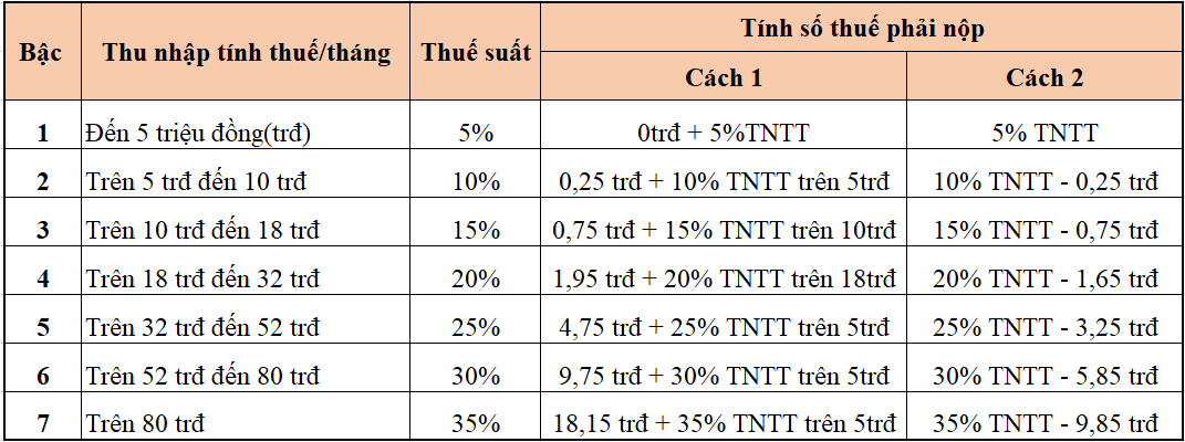 - Trường hợp người lao động ký HĐLĐ >= 3 tháng thì việc tính thuế TNCN sẽ tính theo Biểu lũy tiến từng phần.