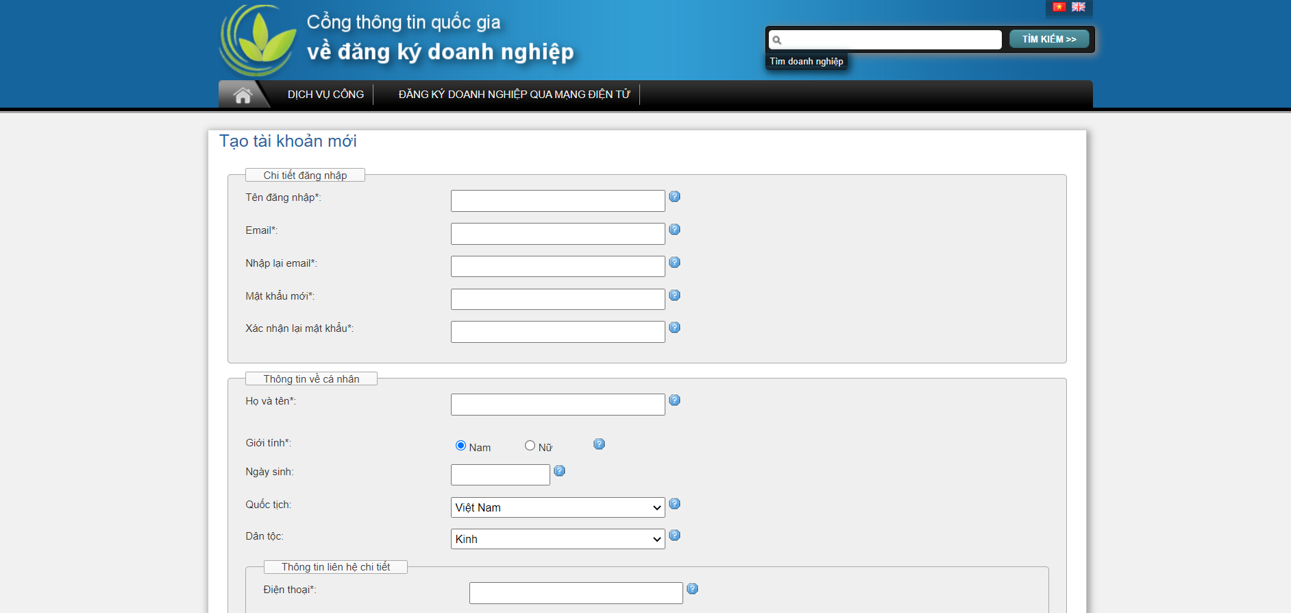 ➥ Chọn “Tạo tài khoản mới” => Điền đầy đủ thông tin tài khoản và thông tin cá nhân để được cấp tài khoản phục vụ cho việc đăng ký kinh doanh online.