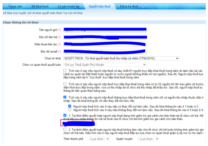 | Chọn cơ quan quyết toán thuế: | Tùy theo trường hợp của người nộp thuế mà tích chọn phù hợp. |
