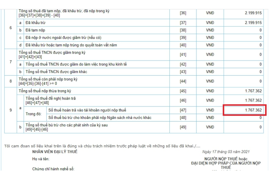 [47]: Số thuế hoàn trả vào tài khoản người nộp thuế: cá nhân có số thuế nộp thừa nếu muốn đề nghị hoàn trả thì phải nhập vào ô này, nếu không đề nghị hoàn trả thì không nhập.