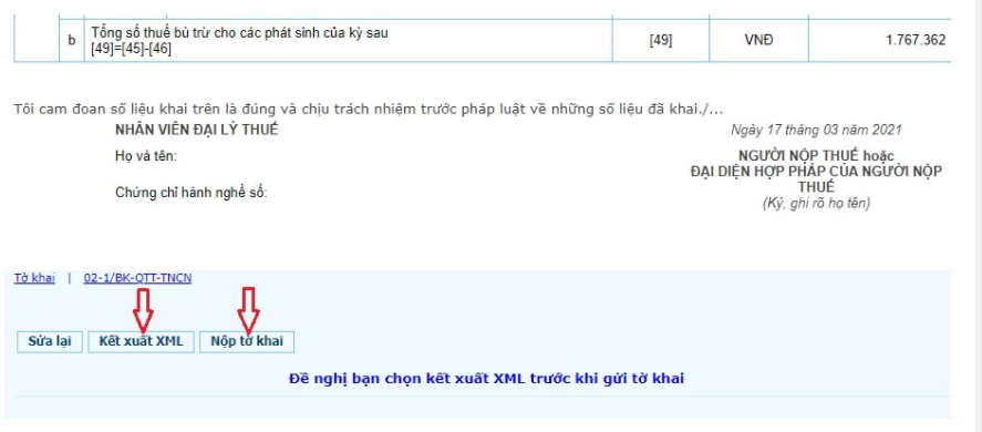 Sau khi chọn “kết xuất XML’, hệ thống sẽ gửi về cho bạn file tờ khai theo định dạng XML. Sử dụng máy tính có cài itax viewer để mở file tờ khai theo định dạng XML>> In >> Ký tên người khai thuế.