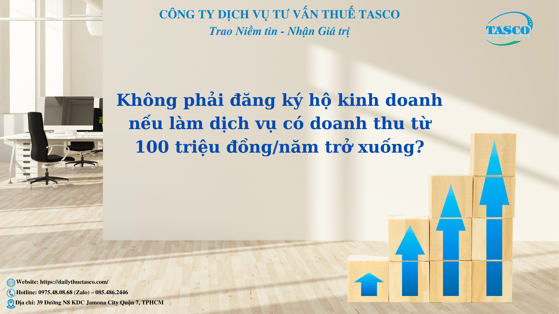 Đại lý thuế Tasco cung cấp thông tin đến quý doanh nhân, doanh nghiệp về quy định mới liên quan đến việc không phải đăng ký hộ kinh doanh nếu làm dịch vụ có doanh thu từ 100 triệu đồng/năm trở xuống.