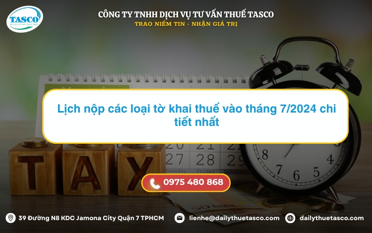 Tháng 7/2024 là thời điểm quan trọng để các doanh nghiệp, tổ chức và cá nhân thực hiện nghĩa vụ thuế theo quy định của pháp luật. Để hỗ trợ quý khách hàng nắm rõ thời hạn nộp thuế, bài viết dưới đây TASCO sẽ cung cấp cho quý khách hàng và các bạn lịch nộp các loại tờ khai thuế vào tháng 7/2024 một cách chi tiết và đầy đủ nhất.