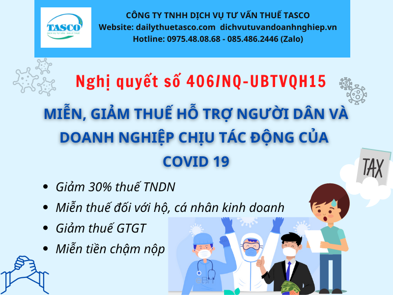 Vào ngày 19/10/2021 vừa qua, Chủ tịch Quốc hội Vương Đình Huệ vừa ký ban hành Nghị quyết số 406/NQ-UBTVQH15 về việc ban hành một số giải pháp nhằm hỗ trợ doanh nghiệp và người dân chịu ảnh hưởng của đại dịch Covid 19. Theo đó, Nghị quyết nêu rõ một số giải pháp về thuế đối với đối tượng là doanh nghiệp và người dân. Đại lý thuế Tasco sẽ thông tin chi tiết về văn bản hỗ trợ này trong bài viết dưới đây, kính mời quý doanh nhân, bạn đọc và người dân cùng tham khảo!