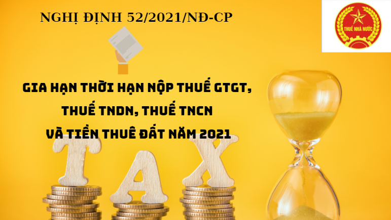 Để hỗ trợ doanh nghiệp gặp khó khăn do dịch bệnh, trên cơ sở đề nghị của Bộ Tài chính, ngày 19/04/2021 Chính phủ đã ban hành Nghị định số 52/2021/NĐ-Cp tiếp tục gia hạn thời hạn nộp thuế giá trị gia tăng, thuế thu nhập doanh nghiệp, thuế thu nhập cá nhân và tiền thuê đất trong năm 2021. Nghị định gồm 05 điều quy định về phạm vi điều chỉnh; đối tượng áp dụng; gia hạn thời hạn nộp thuế và tiền thuê đất, trình tự, thủ tục gia hạn; tổ chức thực hiện và hiệu lực thi hành. Nghị định này có hiệu lực kể từ ngày 19/04/2021.