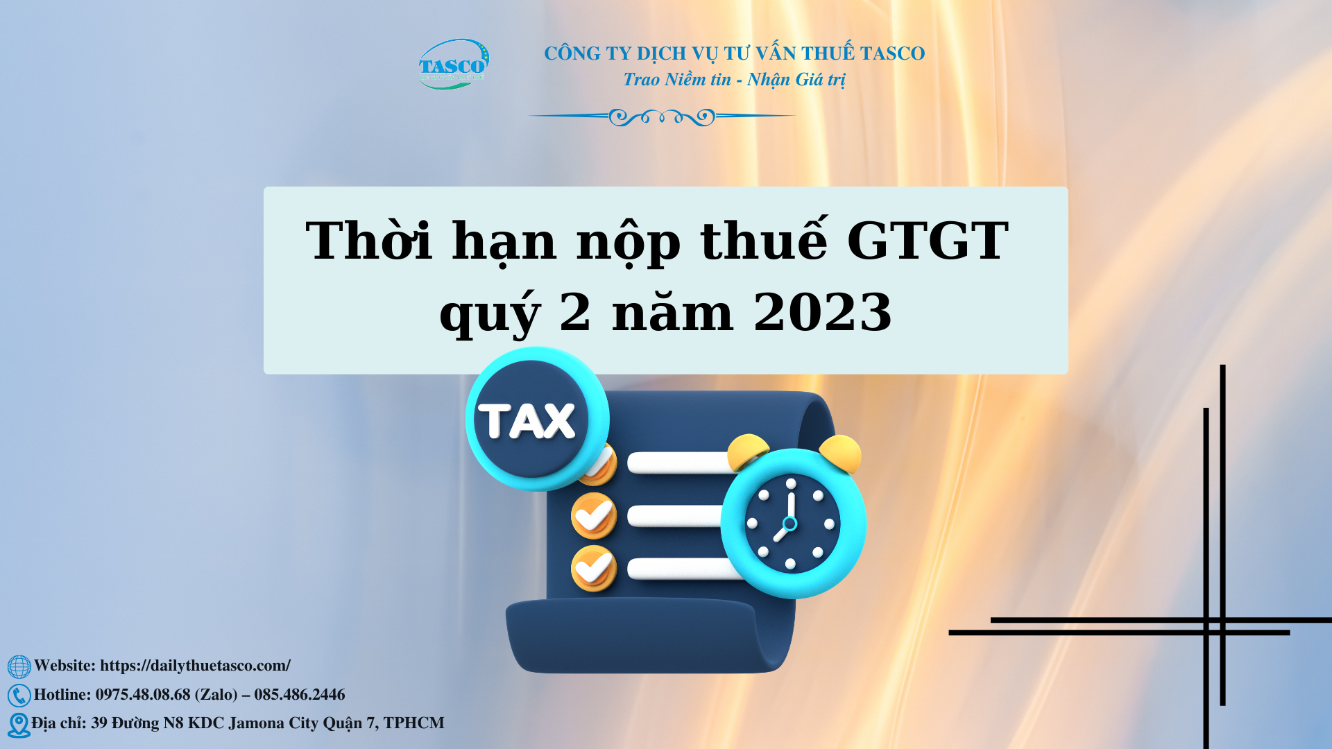 Đại lý thuế Tasco chia sẻ đến quý doanh nghiệp thông tin về thời hạn nộp thuế GTGT quý 2 năm 2023, nhằm giúp quý doanh nghiệp thực hiện đúng các quy định về thuế để thuận lợi trong hoạt động kinh doanh của doanh nghiệp.