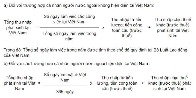 Việc xác định thu nhập chịu thuế từ tiền công, tiền lương tại Việt Nam trong trường hợp cá nhân không cư trú đồng thời làm việc ở Việt Nam và nước ngoài nhưng không tách riêng được phần thu nhập phát sinh tại Việt Nam thì thực hiện theo công thức sau: