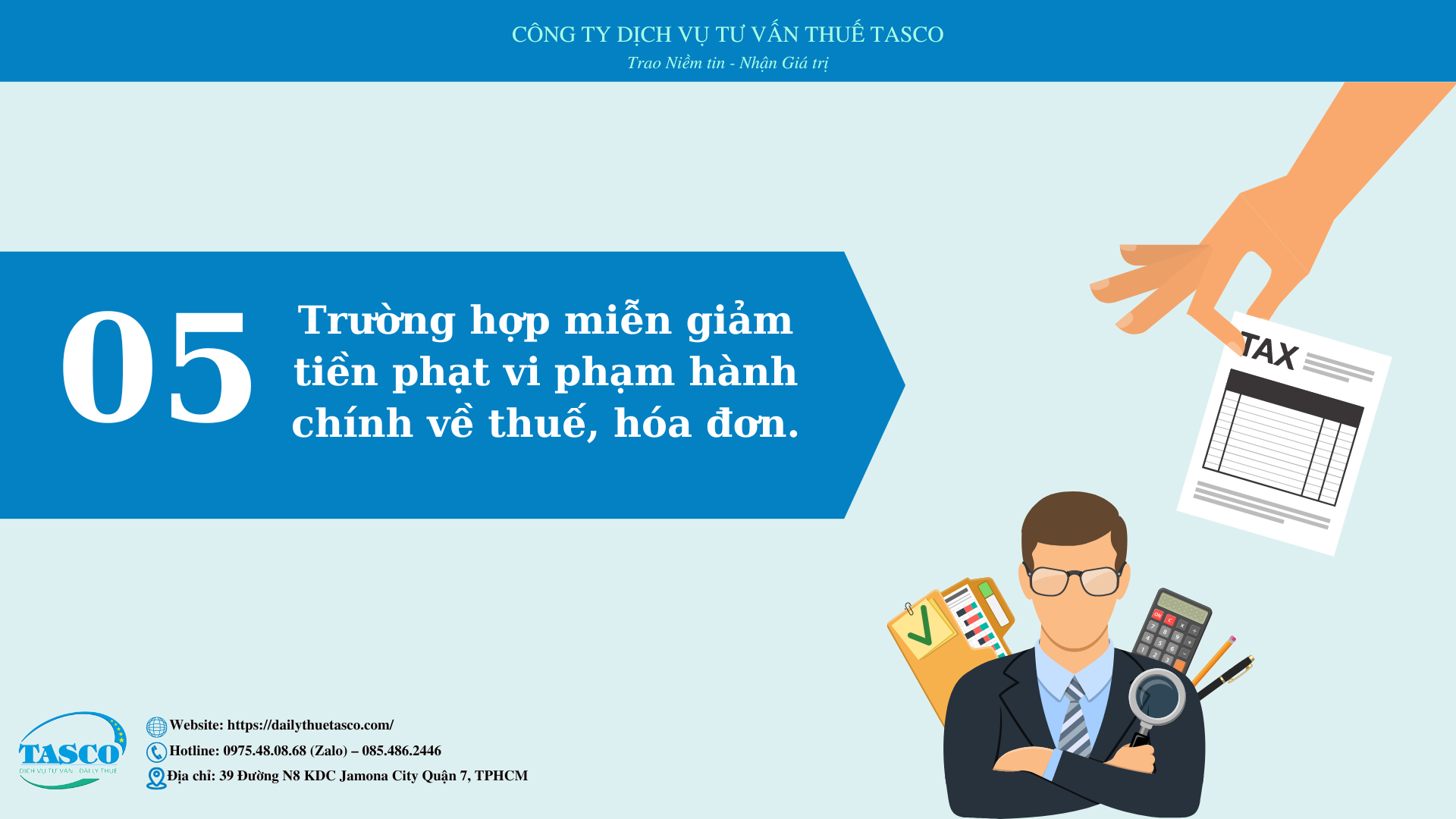 Đại lý thuế Tasco chia sẻ đến quý doanh nhân về 05 trường hợp được miễn, giảm tiền phạt vi phạm hành chính về thuế, hóa đơn.
